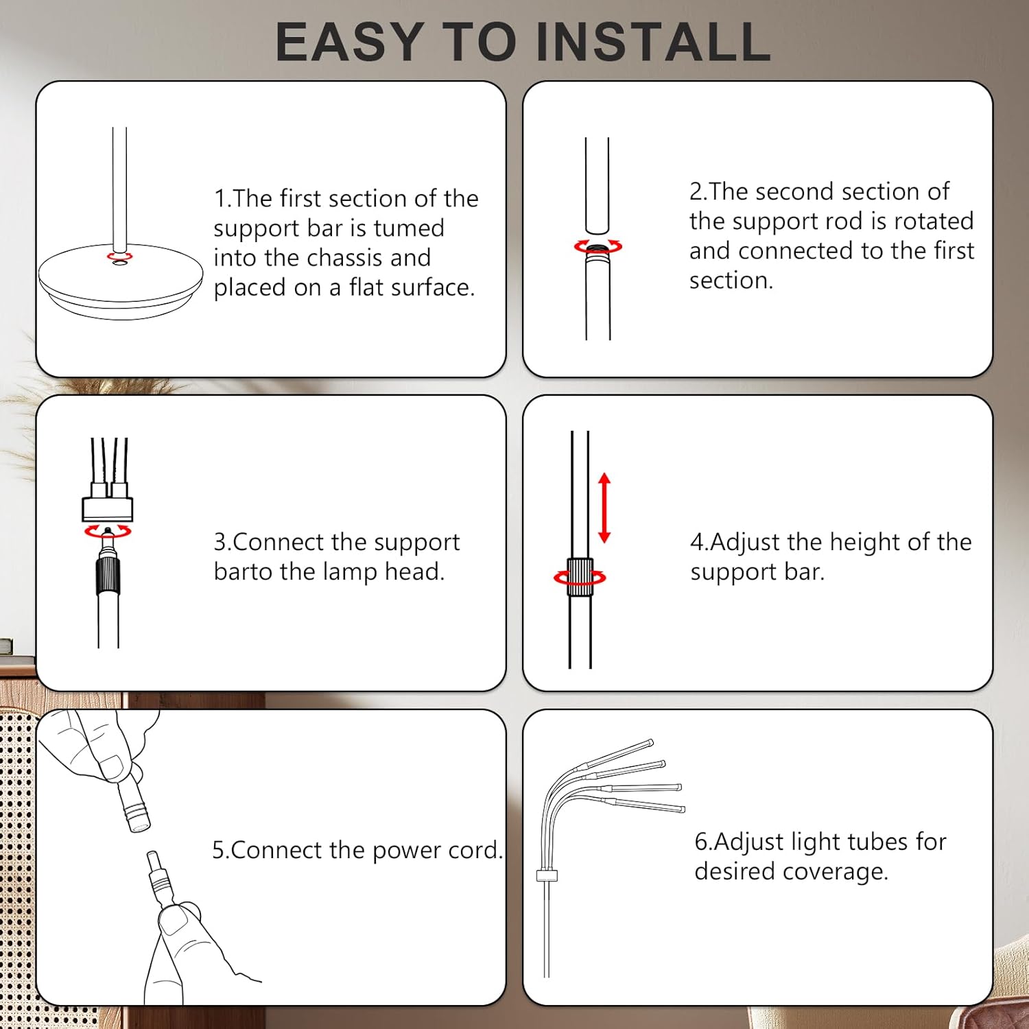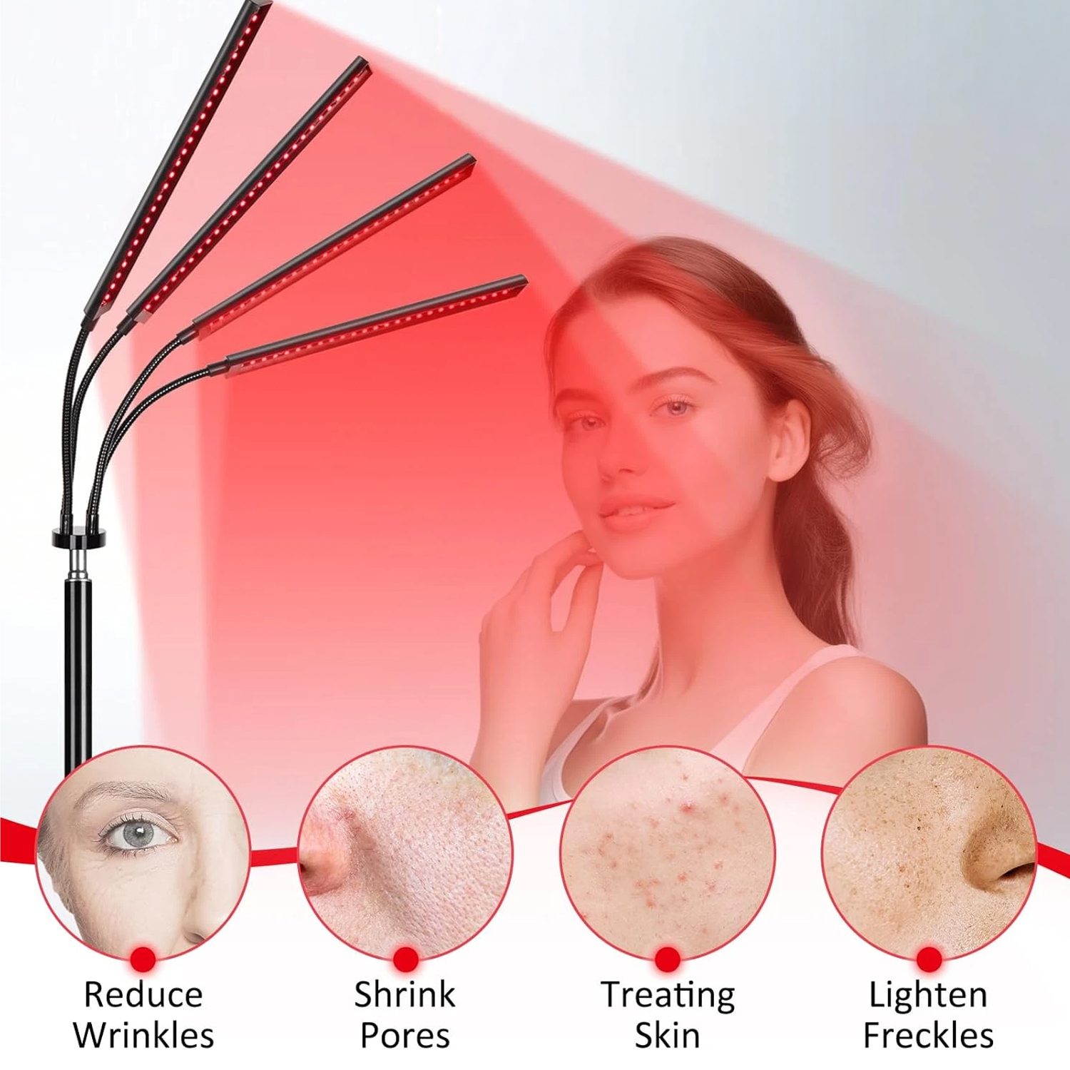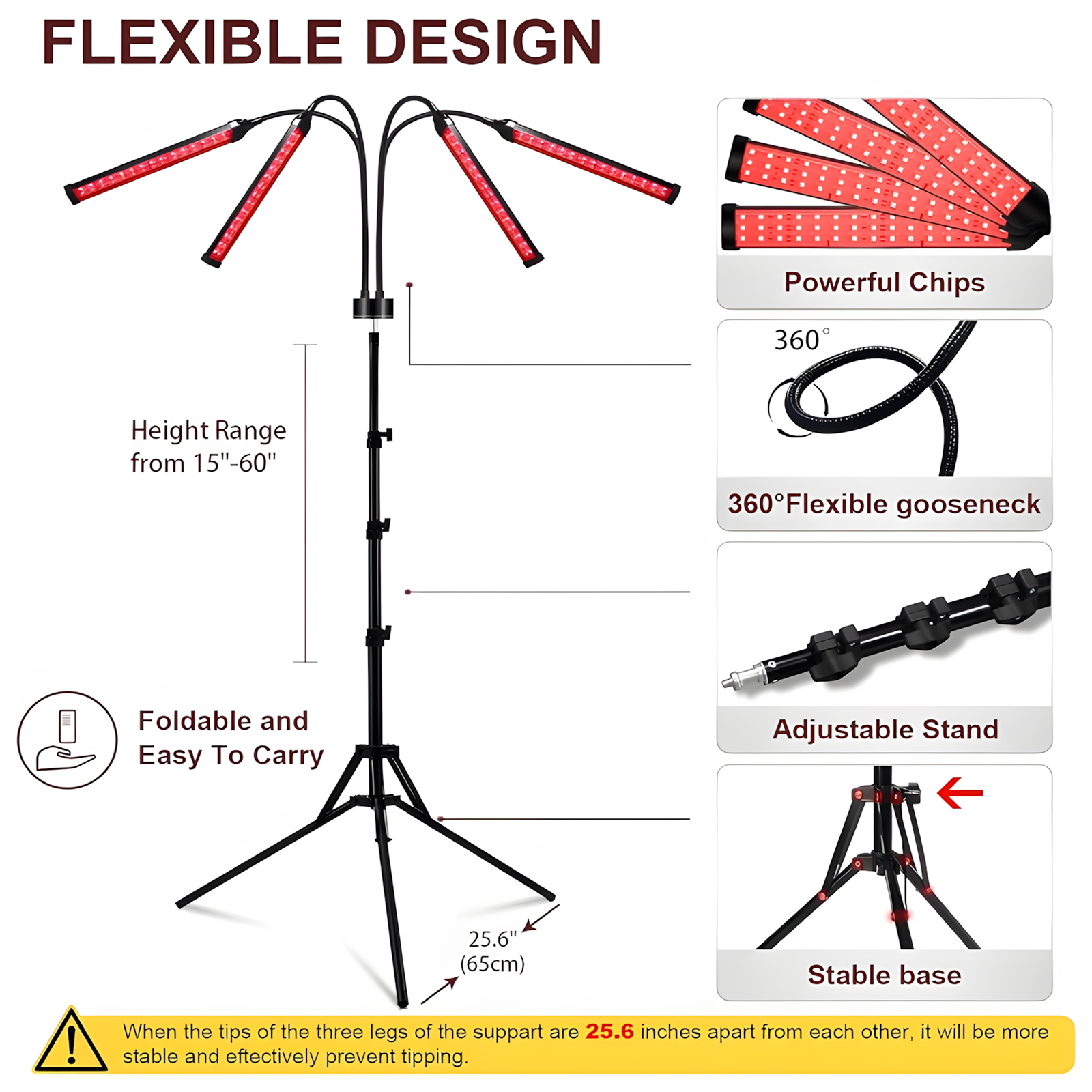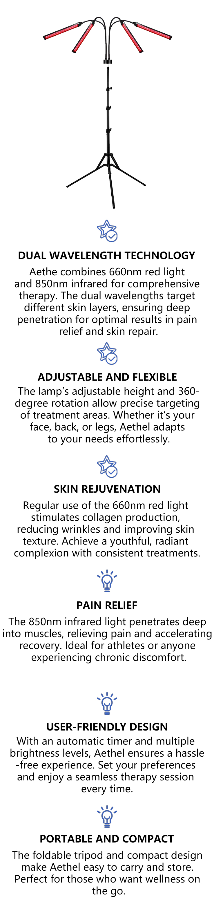 The Aethel red light therapy device features a 360° flexible gooseneck arm, allowing easy angle adjustments for precise skin treatment. The height is adjustable from 15 to 60 inches, catering to various needs. With a foldable design and a stable base, the tripod legs are spaced 25.6 inches apart, offering enhanced stability and preventing tipping for secure use during every session.