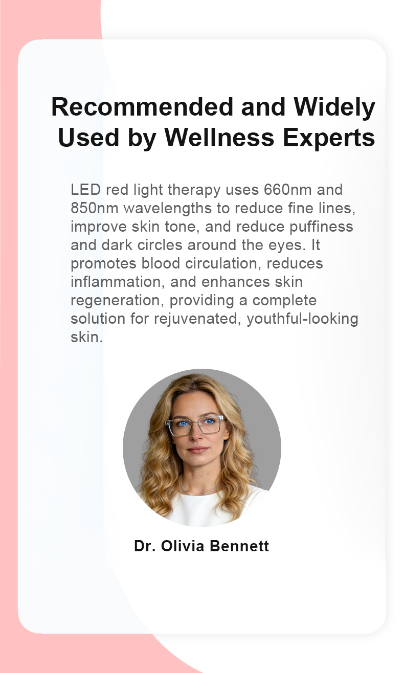 Aethel Red Light Therapy Device uses 660nm and 850nm wavelengths of red and near-infrared light to stimulate collagen production, improve skin tone and texture, tighten pores, alleviate puffiness and dark circles, fade dark spots, promote blood circulation, accelerate healing, and relieve muscle fatigue and discomfort, enhancing both your skin and overall well-being.